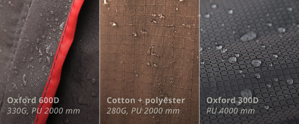 The specification of our tents is marked with the density of the fiber (D) and the water resistance measured in millimeters. The second parameter is the water pressure at which the fabric gets wet. The 2000 mm symbol means that the tent will start to leak when the water column is above 200 cm. For comparison, an ordinary umbrella has a water resistance of approx. 400 mm.