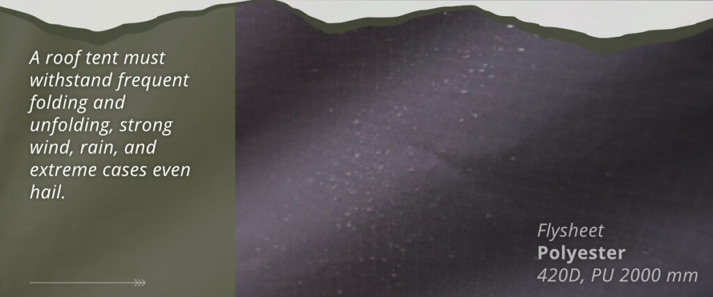 A roof tent must withstand frequent folding and unfolding, strong wind, rain, and in extreme cases even hail. Such forces acting on the material must be properly managed in order for the product to serve for many years. Often, in the descriptions of our tents, we provide different water resistance properties of the tropics and the tent itself. This is due to the fact that using these tents ourselves and consulting ideas with specialists, we decided that elements exposed directly to moisture should have higher water resistance, and those that resist the forces acting on the tent should be more durable.