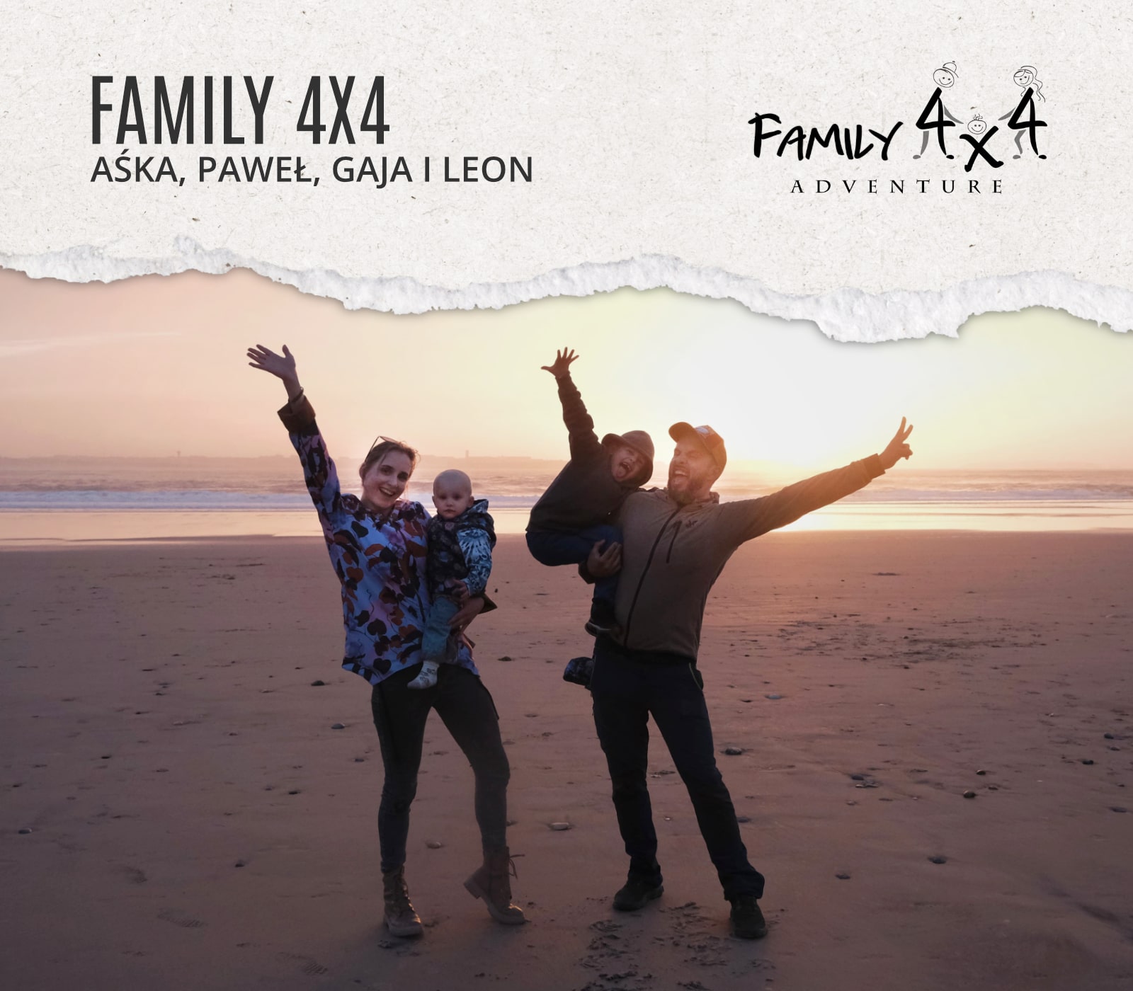 Jesteśmy 4-osobową rodziną (Paweł, Aśka, Leon i Gaja), która by dalej podróżować w swoim stylu po pojawieniu się dzieci na świecie stworzyła projekt Family4x4, czyli wyprawy offroadowe dedykowane rodzinom z dziećmi. Dzieciaki są dla nas pełnoprawnymi uczestnikami eskapad, a nie tylko kibicami