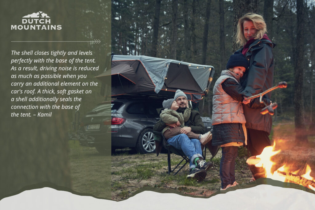 The shell closes tightly and levels perfectly with the base of the tent. As a result, driving noise is reduced as much as possible when you carry an additional element on the car’s roof. A thick, soft gasket on a shell additionally seals the connection with the base of the tent. – Kamil