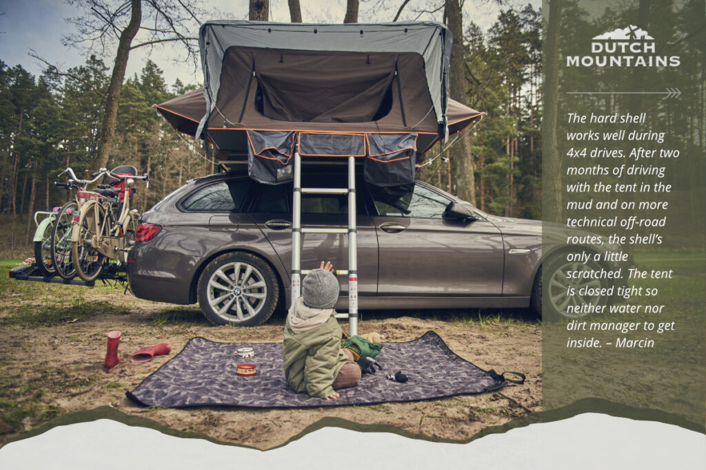 The hard shell works well during 4×4 drives. After two months of driving with the tent in the mud and on more technical off-road routes, the shell’s only a little scratched. The tent is closed tight so neither water nor dirt manager to get inside. – Marcin