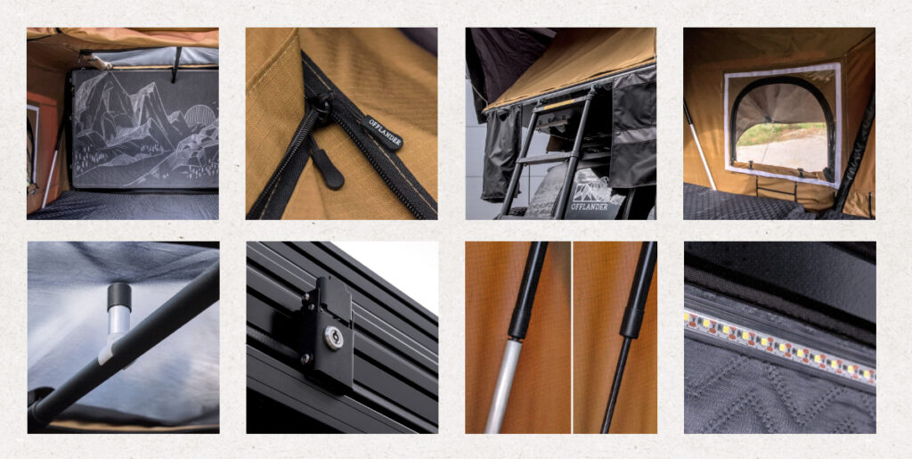Namiot wyposażony został też w zamykane na klucz zamki. Samo otwieranie namiotu zajmuje około 3 minut, co świetnie widać na filmie Slowtravelera. Wprawny właściciel spokojnie rozłoży cały namiot w około 2. Namiot wyposażony jest w drabinkę, torby na buty, matę antykondensacyjną, blokady siłowników oraz oświetlenie LED.