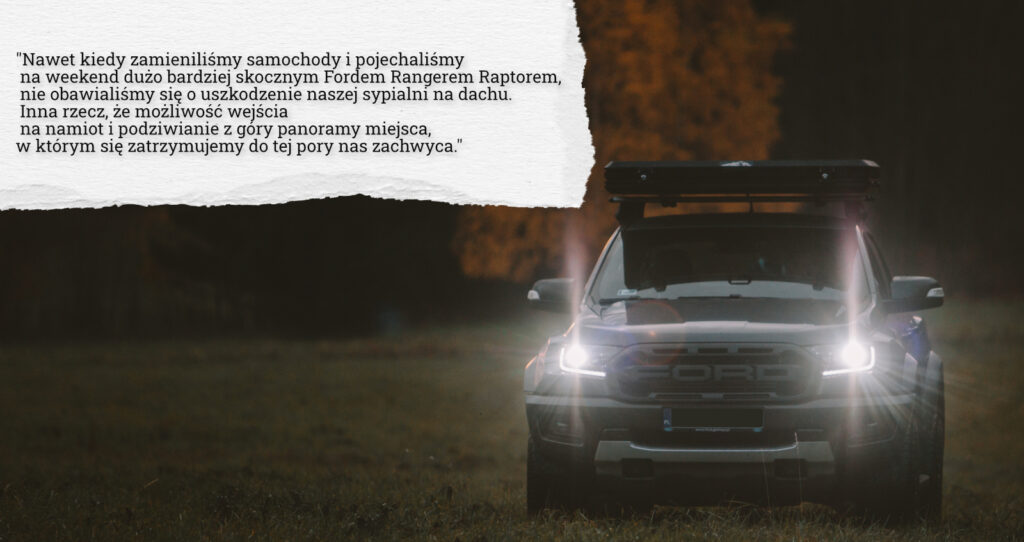 Największą zaletą jest dla nas całkowicie sztywna skorupa namiotu. Wiele razy, podczas przejazdu przez ciasne, leśne dukty, zdarzyło nam się przedzierać przez gałęzie. W przypadku poprzedniego namiotu, którego pokrywa wykonana była z tworzywa, ryzyko uszkodzenia było dość prawdopodobne. Kiedyś nawet dach namiotu poddał się pod ciężarem większego konaru i pojawiło się pęknięcie wymagające naprawy. W przypadku Alutop 3 wszelkie tego typu troski odeszły w niepamięć. Mocna, aluminiowa rama i wypełnienie z wytrzymałego włókna szklanego pozwalają na znacznie więcej. Nawet kiedy zamieniliśmy samochody i pojechaliśmy na weekend dużo bardziej skocznym Fordem Rangerem Raptorem, nie obawialiśmy się o uszkodzenie naszej sypialni na dachu. Inna rzecz, że możliwość wejścia na namiot i podziwianie z góry panoramy miejsca, w którym się zatrzymujemy, do tej pory nas zachwyca.