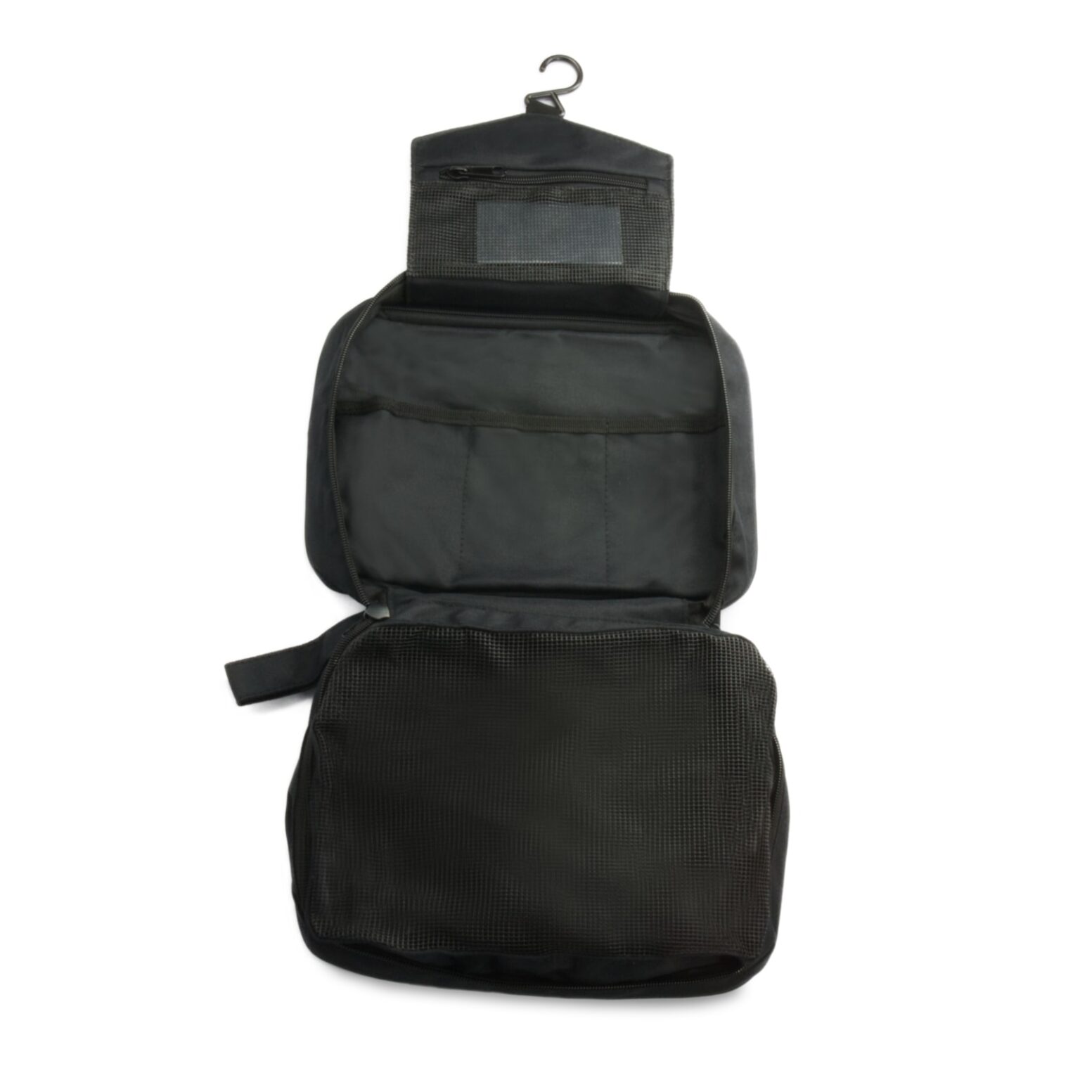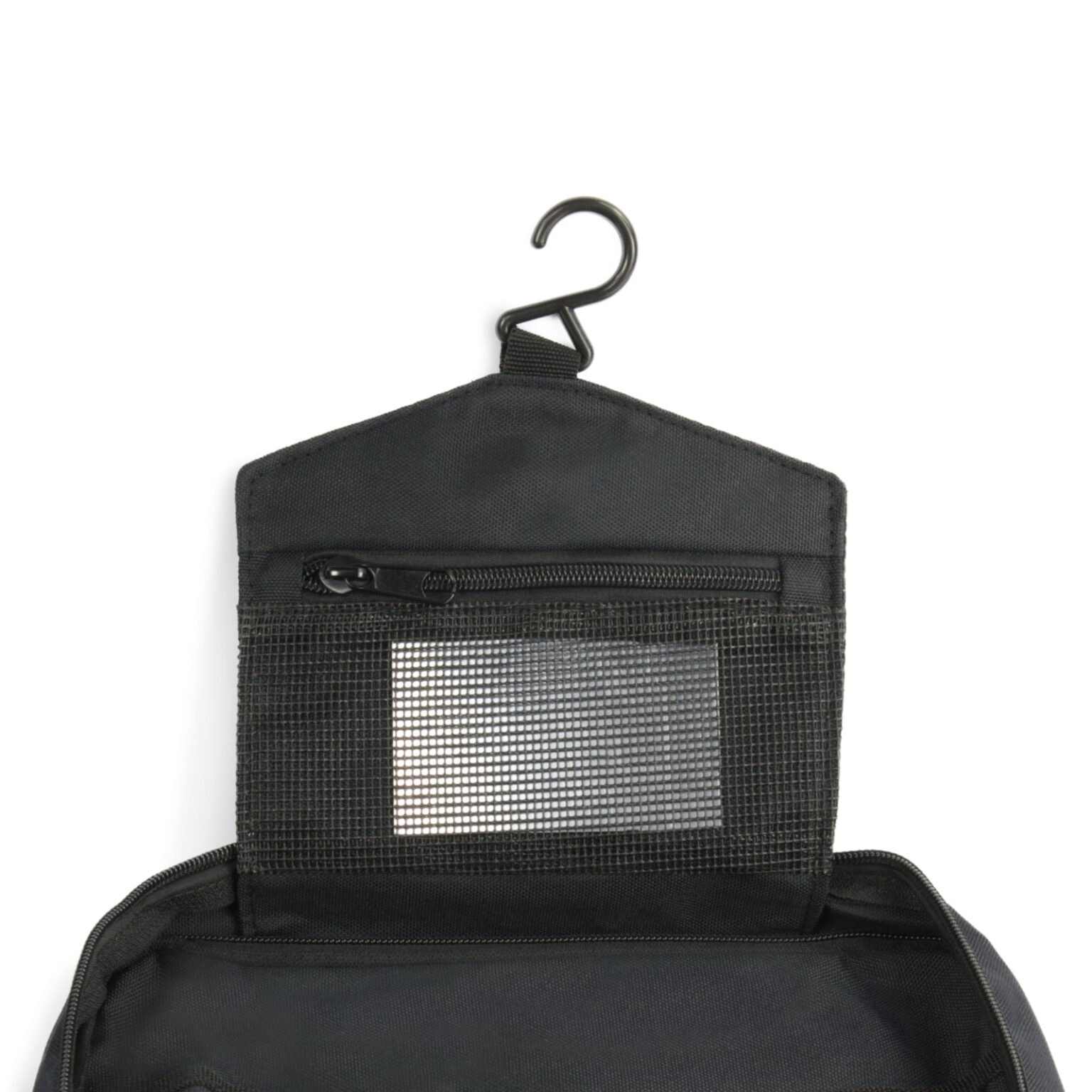 W górnej części znajdziemy haczyk do wieszania i małą kieszonkę na lusterko. Lusterko jest wykonane z tworzywa sztucznego także jest bezpieczne w każdych warunkach. Haczyk natomiast nadaje calości najważniejszej funkcji – możliwości powieszenia kosmetyków podczas użytku. Na przykład w toalecie, pod prysznicem oraz wszędzie, gdzie nie masz miejsca na odłożenie kosmetyczki. Często w podróżach samochodowych jest wieszany na drzwiach lub pod prysznicem turystycznym.