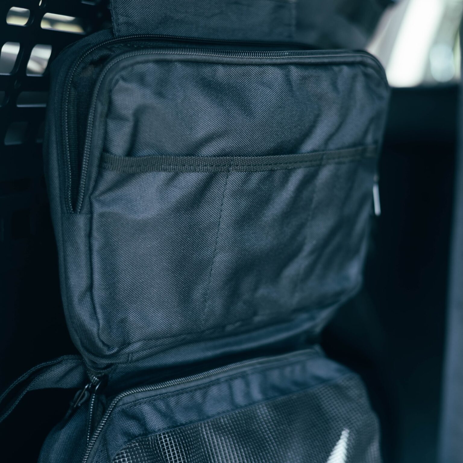Wewnątrz organizera znajdują się dwie główne kieszenie. Obie zamykane na zamek błyskawiczny, który pozwoli na zabezpieczenie odpowiednio tego co jest w środku. Przednia większa kieszeń wykonana jest z grubej siatki o strukturze gumy. Rozwiązanie bardzo praktyczne i przejrzyste dla użytkownika, tutaj zapewne schowany buteleczki i inne zamykane przedmioty.