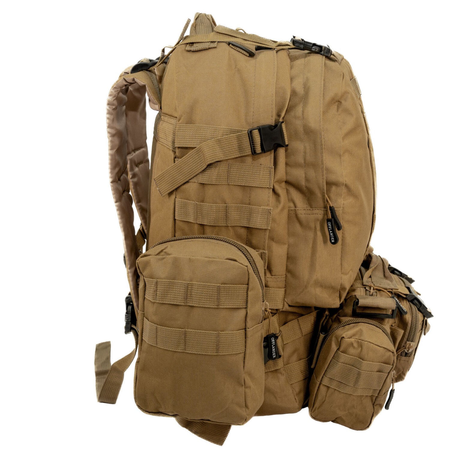 W zestawie do plecaka dołączone są dwie saszetki i jedna osobna wielofunkcyjna torba od frontu. Doczepiona jest ona do plecaka za pomocą pasków Molle z zatrzaskami oraz zabezpieczona dodatkowymi paskami kompresyjnymi z klamrami. Dwie mniejsze saszetki są zabezpieczone do boków plecaka za pomocą rzepów, dla szybkiego sciągania i zakładania. Mniejsze saszetki posiadają w środku dodatkowe otwarte kieszenie, co ułatwia organizację drobnych przedmiotów.