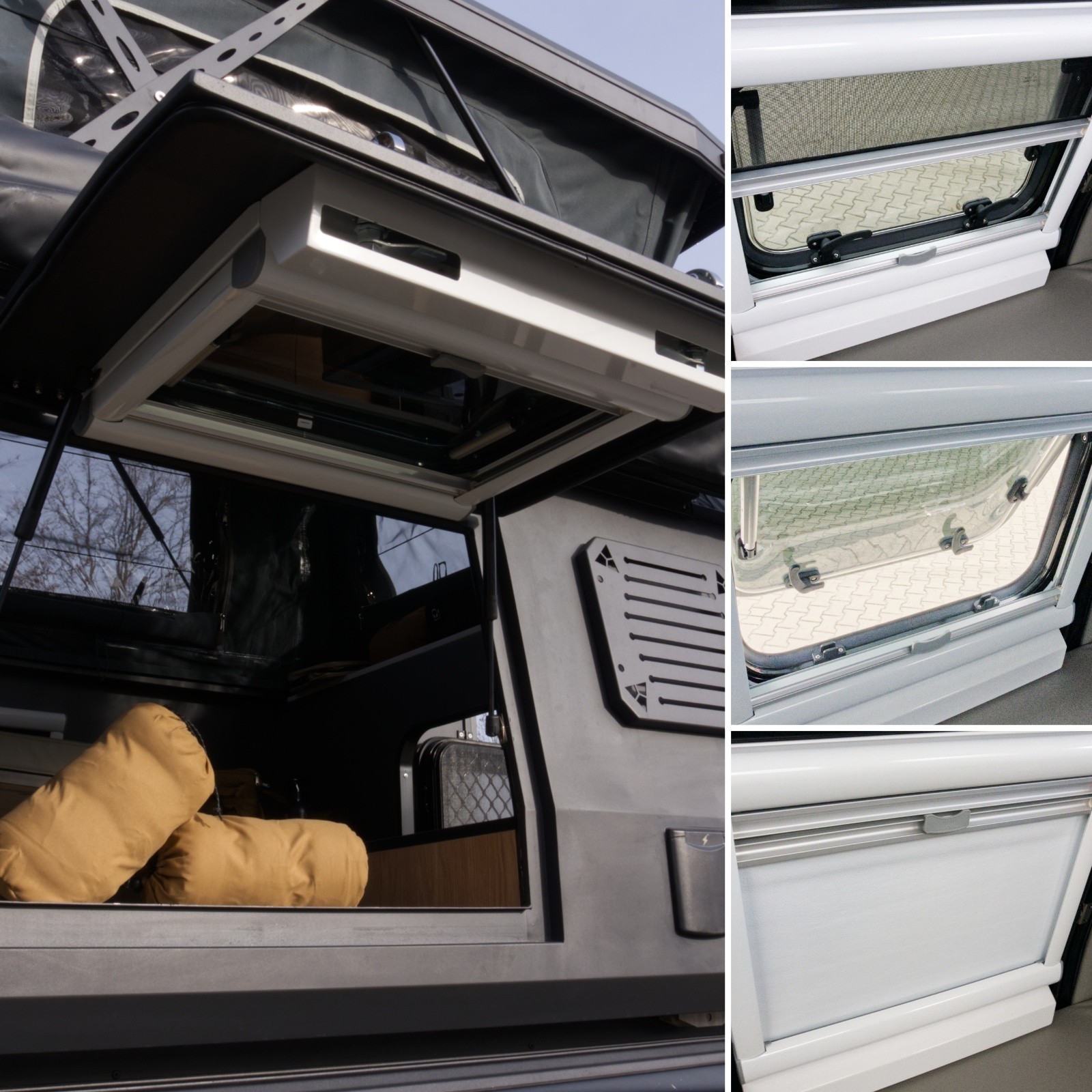Drzwi kapsuły są dwuwarstwowe i systemowe, wyposażone w moskitierę. Zapewniają lepszą izolację akustyczną i cieplną oraz umożliwiają wietrzenie wnętrza bez wpuszczania owadów. Systemowe okna posiadają moskitierę i żaluzję. Można je w pełni otworzyć lub tylko uchylić, aby regulować ilość światła i powietrza. Dodatkową izolację zapewniają materiały namiotu w części podnoszonej.
