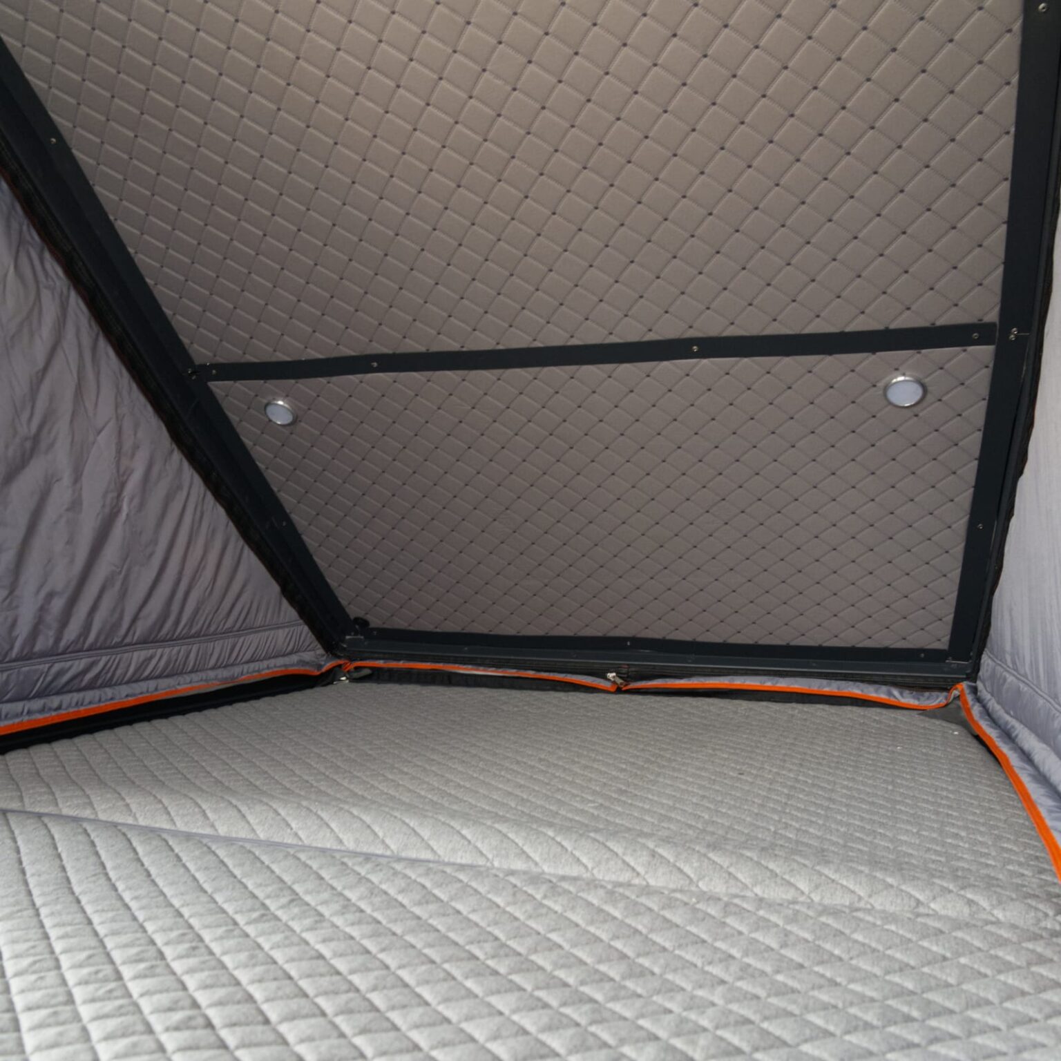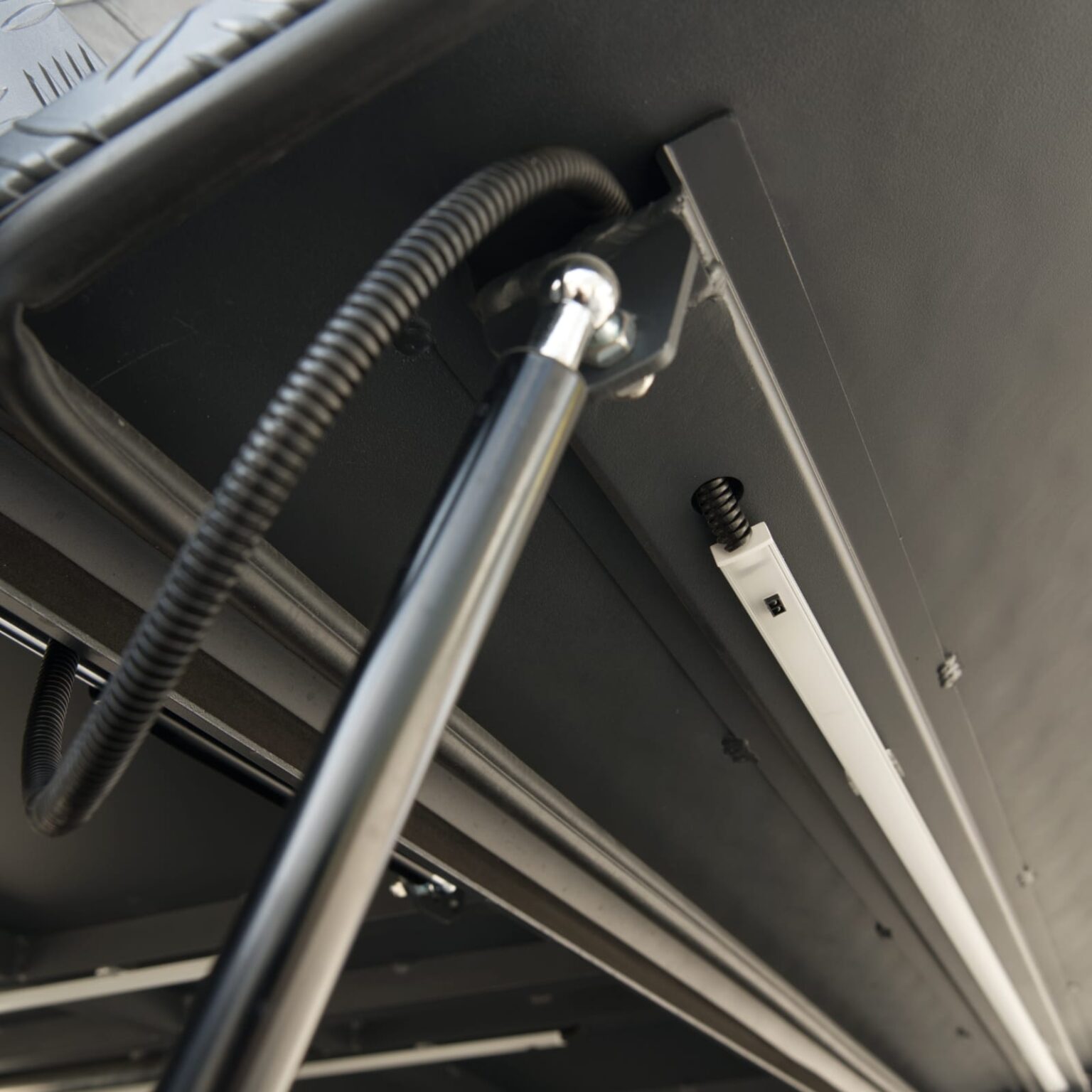 Wewnątrz kapsuły znajdziesz materac o grubości 8 cm i miejsce do spania dla dwóch dorosłych oraz dziecka – wszystko składane w taki sposób, by po złożeniu pozostało miejsce na poduszki i kołdrę. Oświetlenie LED, rozlokowane w sześciu punktach na suficie, zasilane jest z instalacji pojazdu, co upraszcza użytkowanie w trasie.