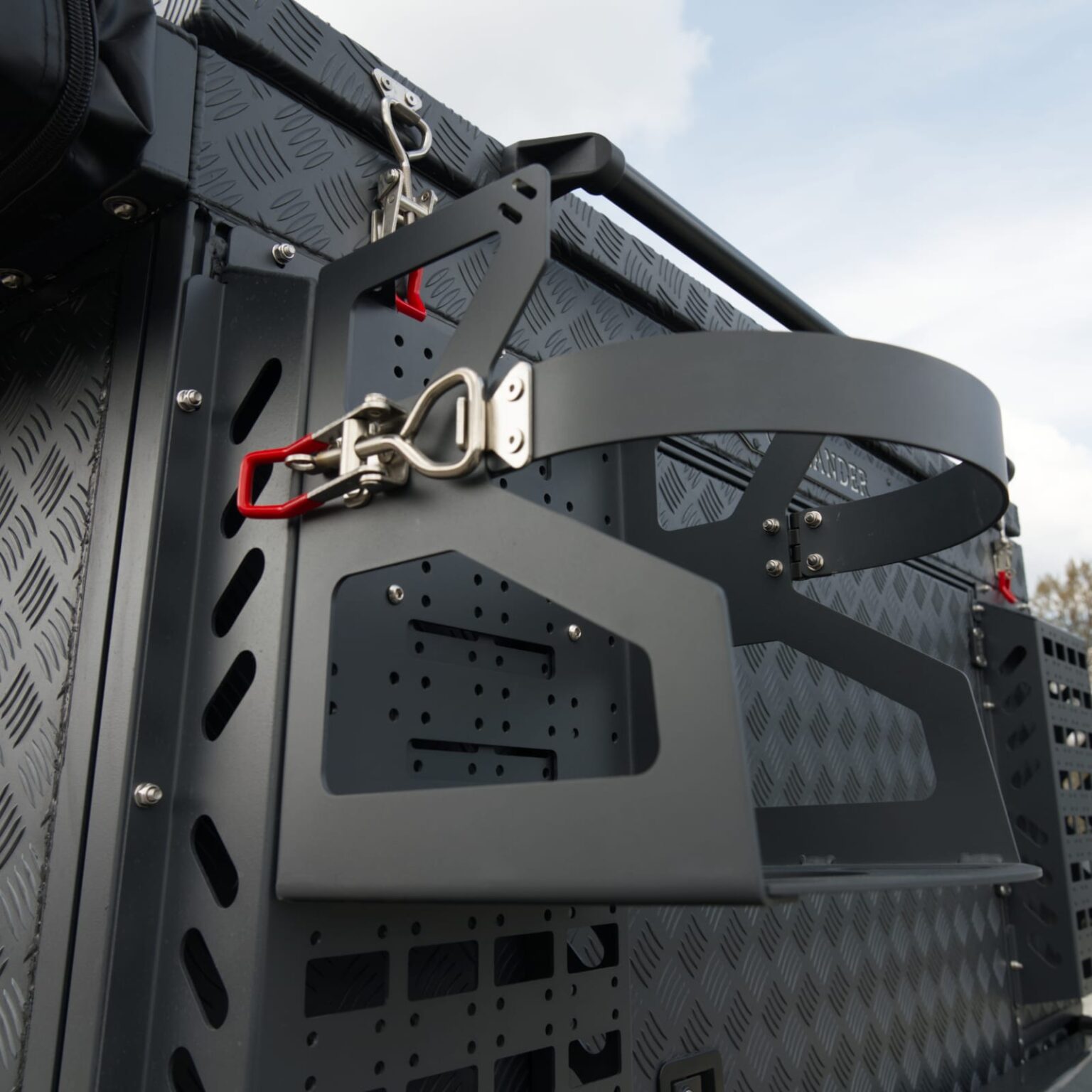 Draa montowana jest na stałe do burt paki – to sprawia, że idealnie integruje się z samochodem i staje się jego naturalnym przedłużeniem. Konstrukcja w pełni aluminiowa, z dodatkowymi listwami montażowymi na dachu i kratką MOLLE na drzwiach, to gwarancja nie tylko trwałości, ale i możliwości dalszej rozbudowy.