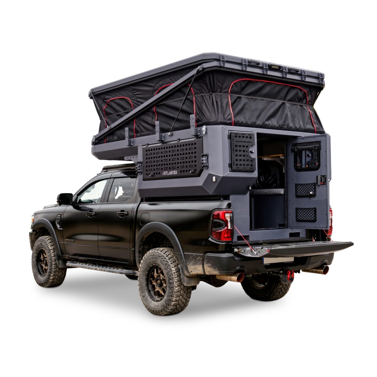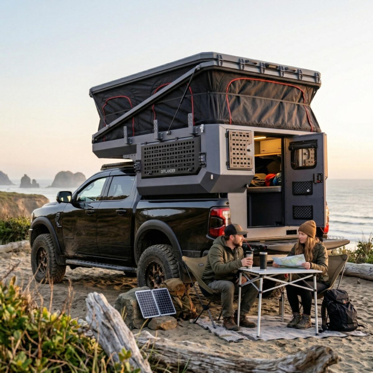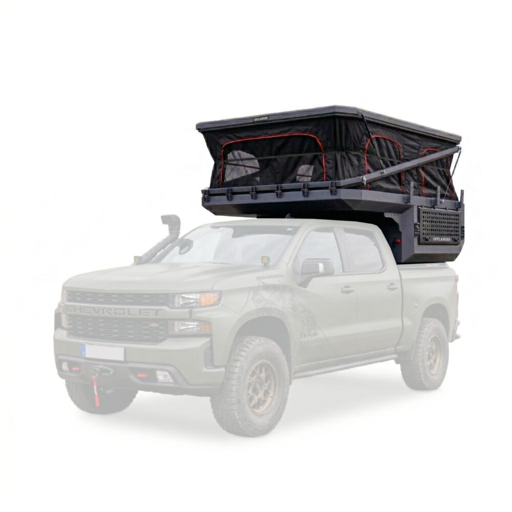 OFFLANDER DUNA US to nietuzinkowa i odważna konstrukcja, stworzona dla tych, którzy chcą w pełni wykorzystać potencjał potężnych amerykańskich pickupów typu Full-Size (RAM 1500, Ford F-150, Toyota Tundra). Zaprojektowana specjalnie pod krótkie paki o długości ok. 170 cm (5,5″), stanowi idealne dopełnienie szerokich i masywnych sylwetek amerykańskich legend, nadając im wyprawowego sznytu bez utraty ich surowego charakteru. Fundamentem wytrzymałości tej kabiny jest pancerne aluminium o grubości 3 mm, które pozwala zachować optymalne właściwości jezdne auta w trudnym terenie. Zastosowana trójwarstwowa izolacja o grubości 30 mm zapewnia komfort w każdych warunkach pogodowych, a innowacyjny dach hybrydowy gwarantuje stabilność konstrukcji oraz cenną, dodatkową przestrzeń transportową.