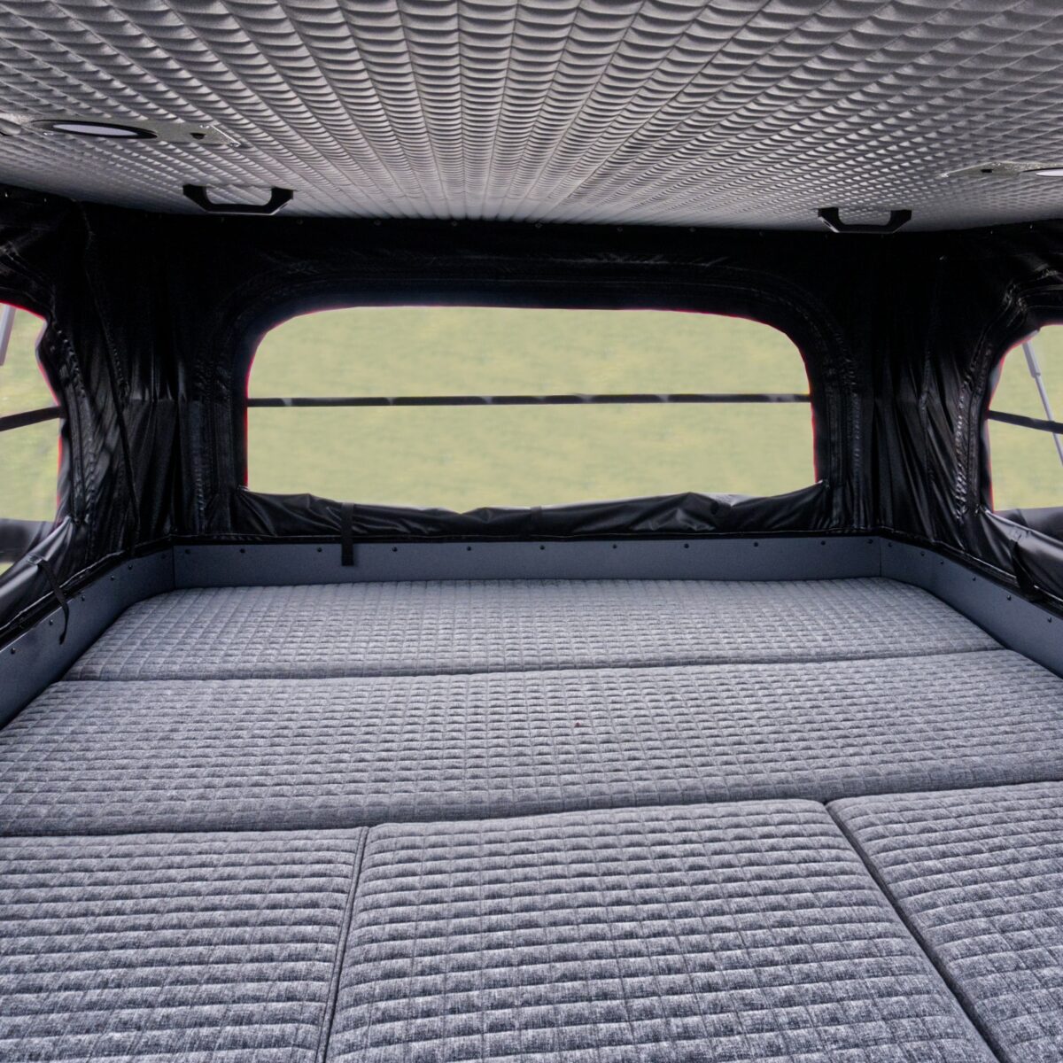 - Bezpieczeństwo i dostęp: Bezpieczeństwo oraz wygodny dostęp do wnętrza opierają się na solidnych drzwiach wejściowych wyposażonych w podwójny mechanizm blokujący, który gwarantuje pewne zamknięcie i sztywność konstrukcji nawet podczas jazdy w wymagającym terenie. Drzwi posiadają zintegrowane okno z moskitierą oraz roletę zaciemniającą, co pozwala na swobodną regulację dopływu światła przy zachowaniu pełnej prywatności. Kluczowym elementem systemu zabezpieczeń jest fakt, że fabryczna klapa pickupa po zamknięciu stanowi dodatkową, zewnętrzną barierę ochronną, domykającą całą konstrukcję od tyłu.