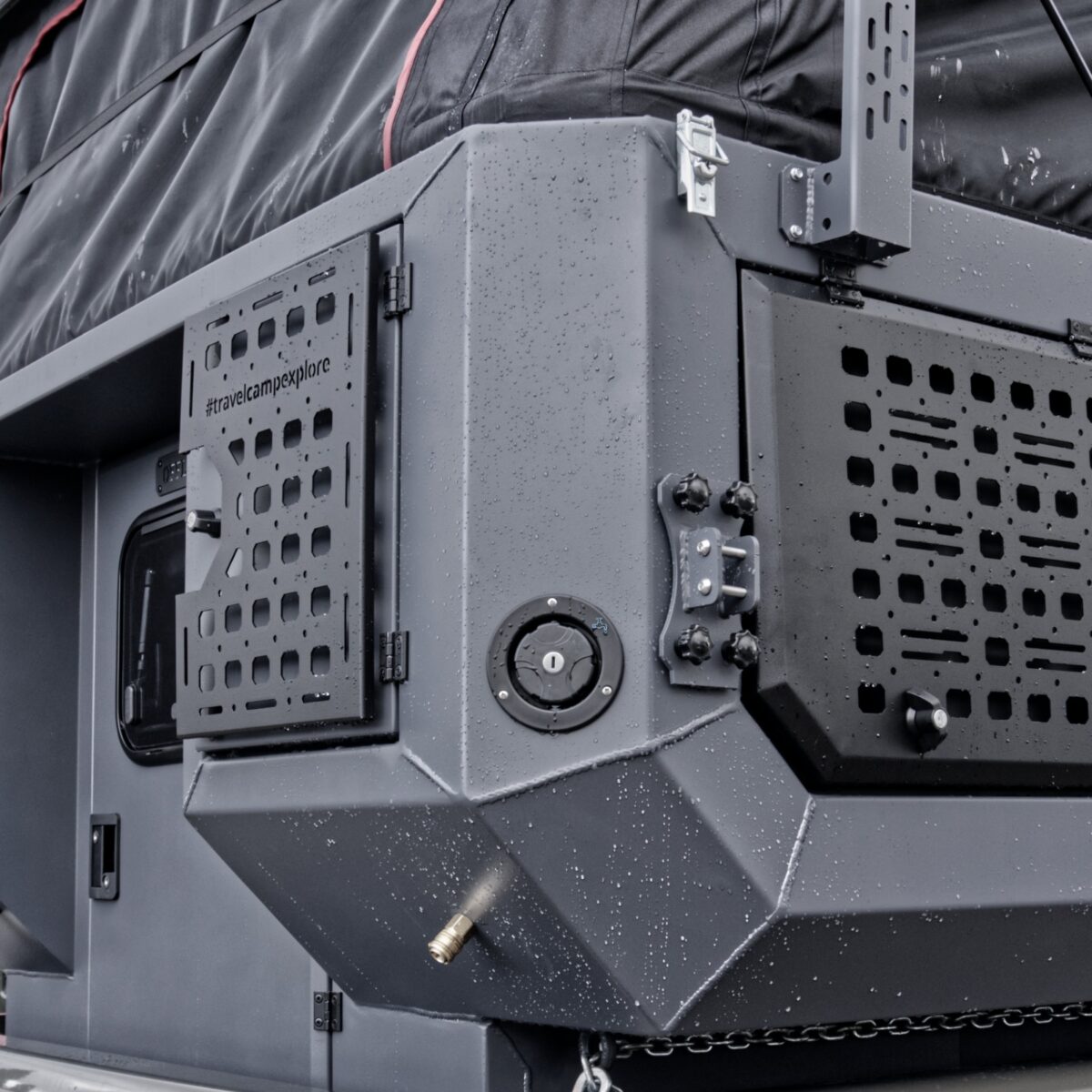 - Systemy Wodne i Sanitarne: Powiększony zbiornik o pojemności 60 litrów posiada zewnętrzny wlot zabezpieczony kluczem. Cała instalacja pracuje pod ciśnieniem, a kontrolę zasobów umożliwia precyzyjny wskaźnik poziomu wody. Do dyspozycji jest prysznic zewnętrzny, a wewnątrz gotowe przyłącze wodne z możliwością rozbudowy o moduł kuchenny.
