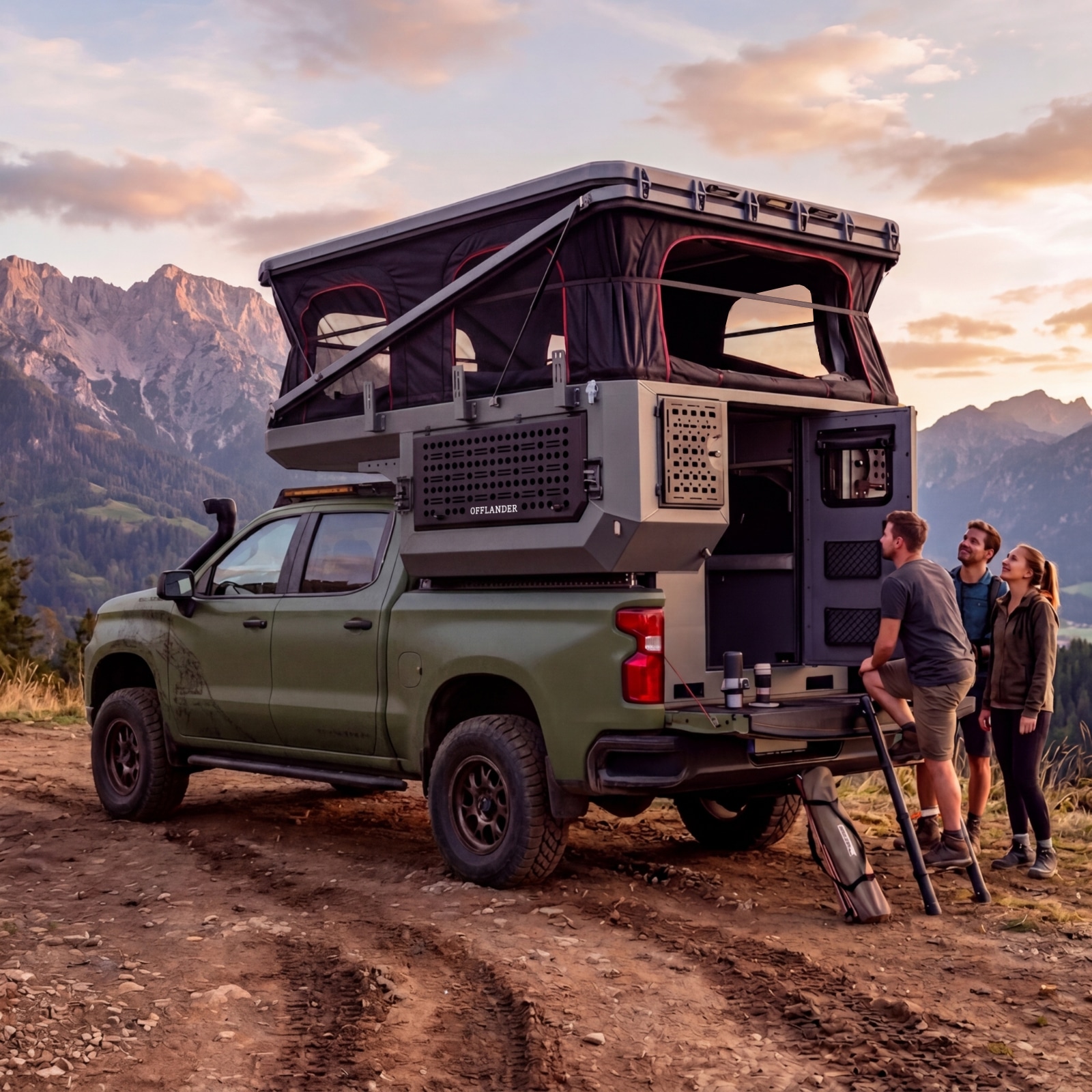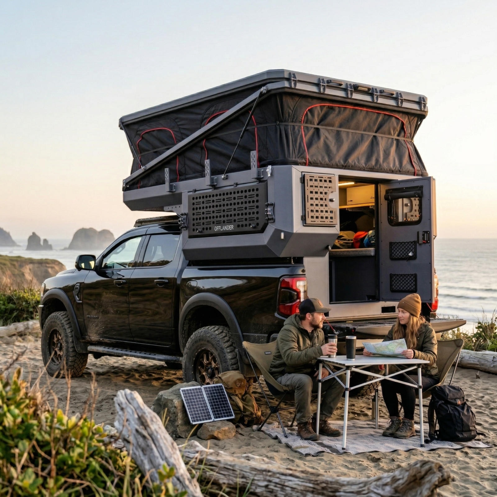 OFFLANDER DUNA US to nietuzinkowa i odważna konstrukcja, stworzona dla tych, którzy chcą w pełni wykorzystać potencjał potężnych amerykańskich pickupów typu Full-Size (RAM 1500, Ford F-150, Toyota Tundra). Zaprojektowana specjalnie pod krótkie paki o długości ok. 170 cm (5,5″), stanowi idealne dopełnienie szerokich i masywnych sylwetek amerykańskich legend, nadając im wyprawowego sznytu bez utraty ich surowego charakteru. Fundamentem wytrzymałości tej kabiny jest pancerne aluminium o grubości 3 mm, które pozwala zachować optymalne właściwości jezdne auta w trudnym terenie. Zastosowana trójwarstwowa izolacja o grubości 30 mm zapewnia komfort w każdych warunkach pogodowych, a innowacyjny dach hybrydowy gwarantuje stabilność konstrukcji oraz cenną, dodatkową przestrzeń transportową.