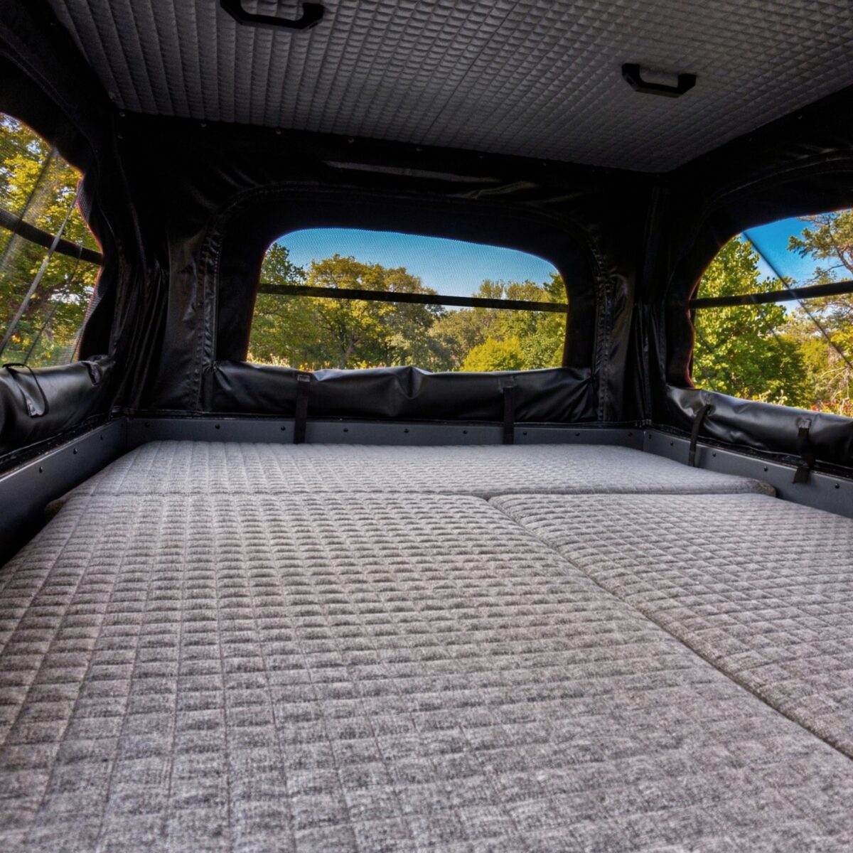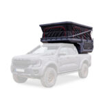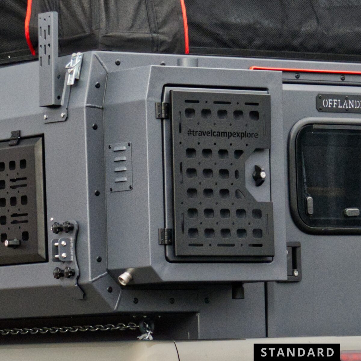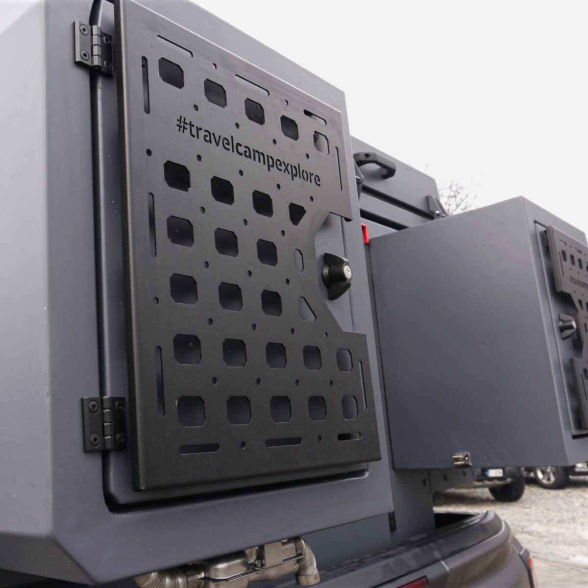 - Bezpieczeństwo i dostęp: Bezpieczeństwo oraz wygodny dostęp do wnętrza opierają się na solidnych drzwiach wejściowych wyposażonych w podwójny mechanizm blokujący, który gwarantuje pewne zamknięcie i sztywność konstrukcji nawet podczas jazdy w wymagającym terenie. Drzwi posiadają zintegrowane okno z moskitierą oraz roletę zaciemniającą, co pozwala na swobodną regulację dopływu światła i świeżego powietrza przy zachowaniu pełnej prywatności. Kluczym elementem systemu zabezpieczeń jest fakt, że fabryczna klapa pickupa po zamknięciu stanowi dodatkową, zewnętrzną barierę ochronną. Domyka ona całą konstrukcję od tyłu.