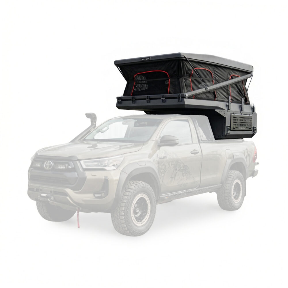 OFFLANDER WADI L to profesjonalna kabina wyprawowa zaprojektowana z myślą o maksymalnym wykorzystaniu przestrzeni ładunkowej pickupów typu Single Cab oraz Extra-Cab. Model ten jest wynikiem naszego wieloletniego doświadczenia, w którym priorytetem była bezkompromisowa jakość i pełna funkcjonalność w każdych warunkach. Fundamentem konstrukcji jest pancerne aluminium o grubości 3 mm, które przy niskiej masie własnej od 375 kg pozwala zachować optymalne właściwości jezdne auta nawet w ekstremalnie trudnym terenie. Dzięki zastosowaniu trójwarstwowej izolacji o grubości 30 mm użytkownik zyskuje pełen komfort termiczny przez cały rok, a innowacyjny dach hybrydowy zapewnia wyjątkową stabilność i dodatkową nośność dla ekwipunku transportowanego na górze