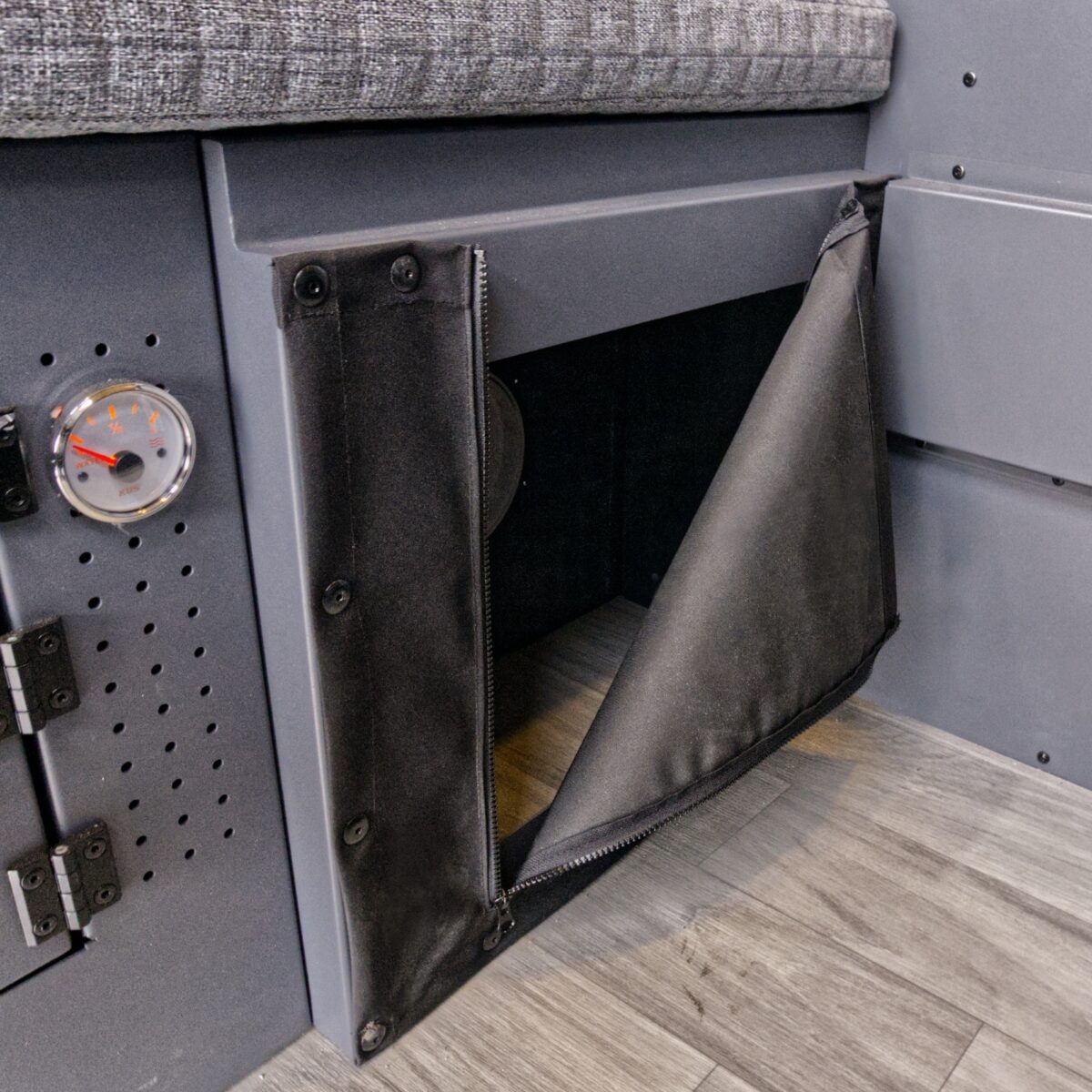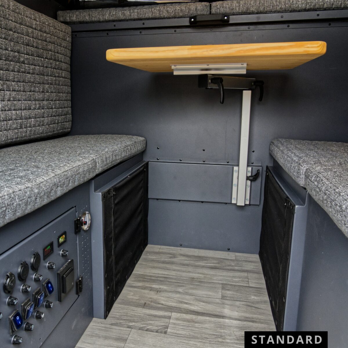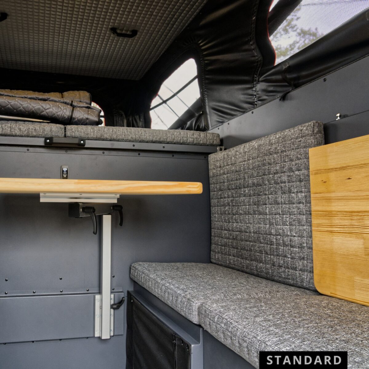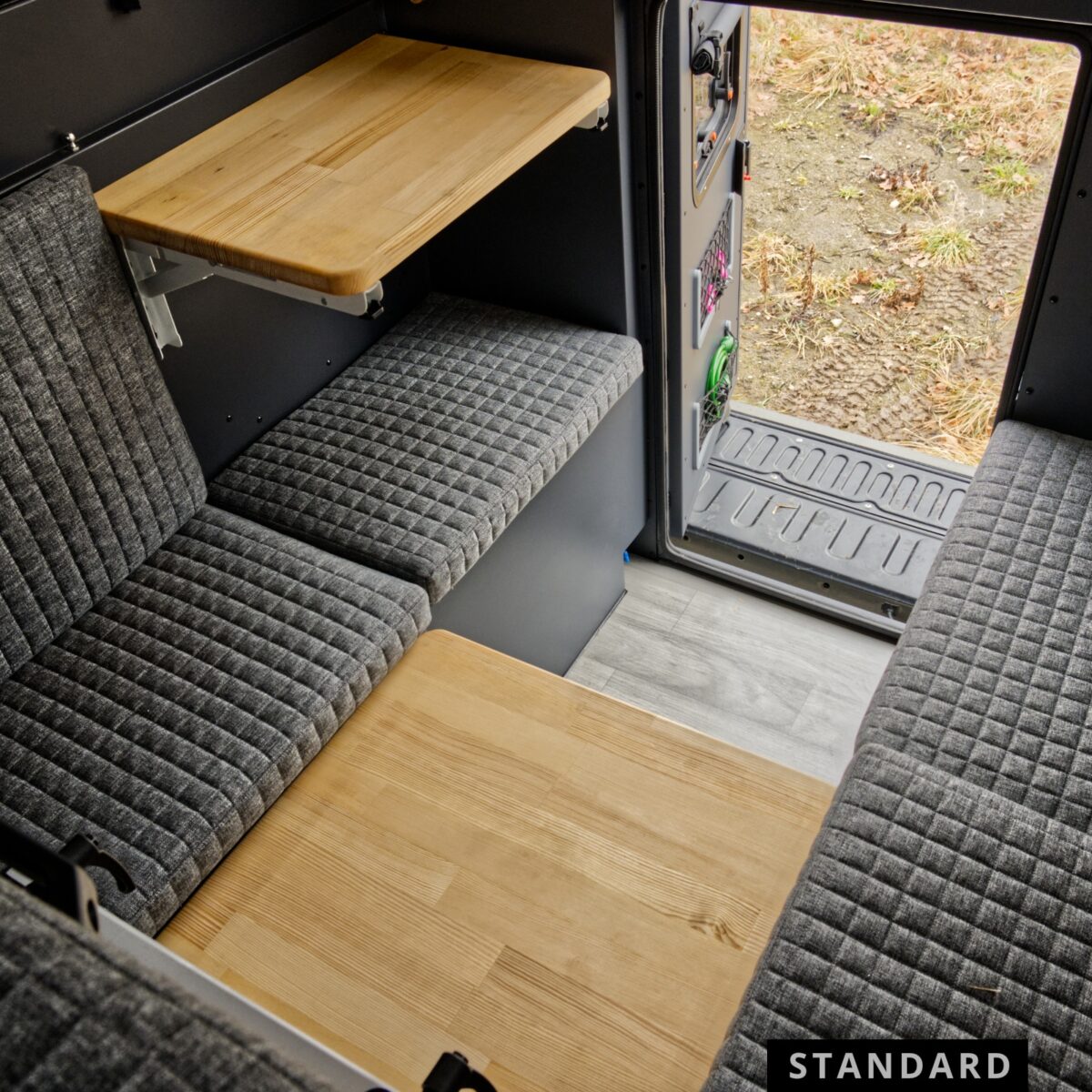 - Elektryka i Autonomia: Standardowe wyposażenie kabiny obejmuje pakiet Full Energy, w którego skład wchodzi panel solarny 150W, regulator MPPT, ładowarka DC/DC wraz z podłączeniem do alternatora samochodu oraz inwerter 600W. Nad sprawnym działaniem systemów czuwa analogowy panel sterowania wyposażony w woltomierz, termometr oraz porty USB.