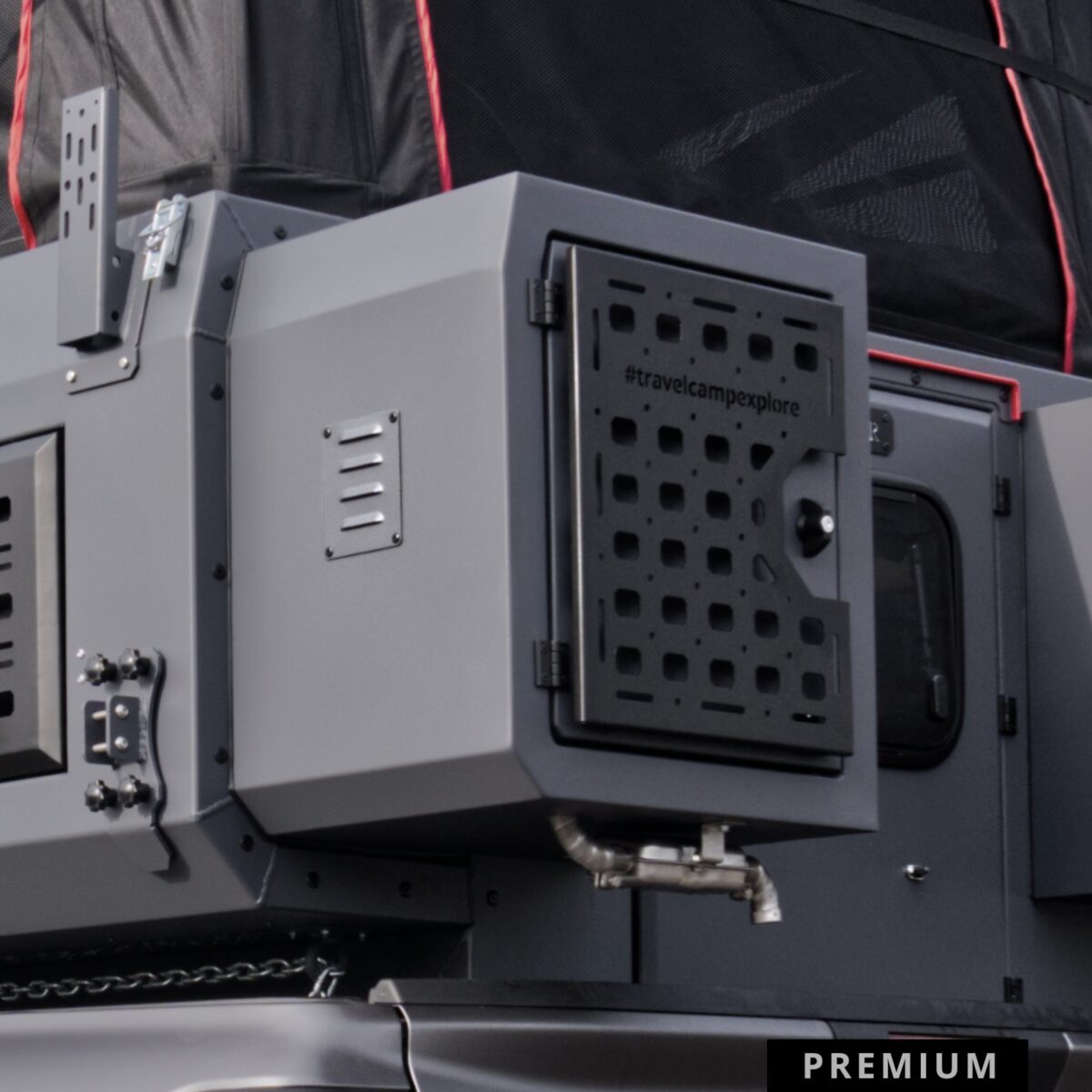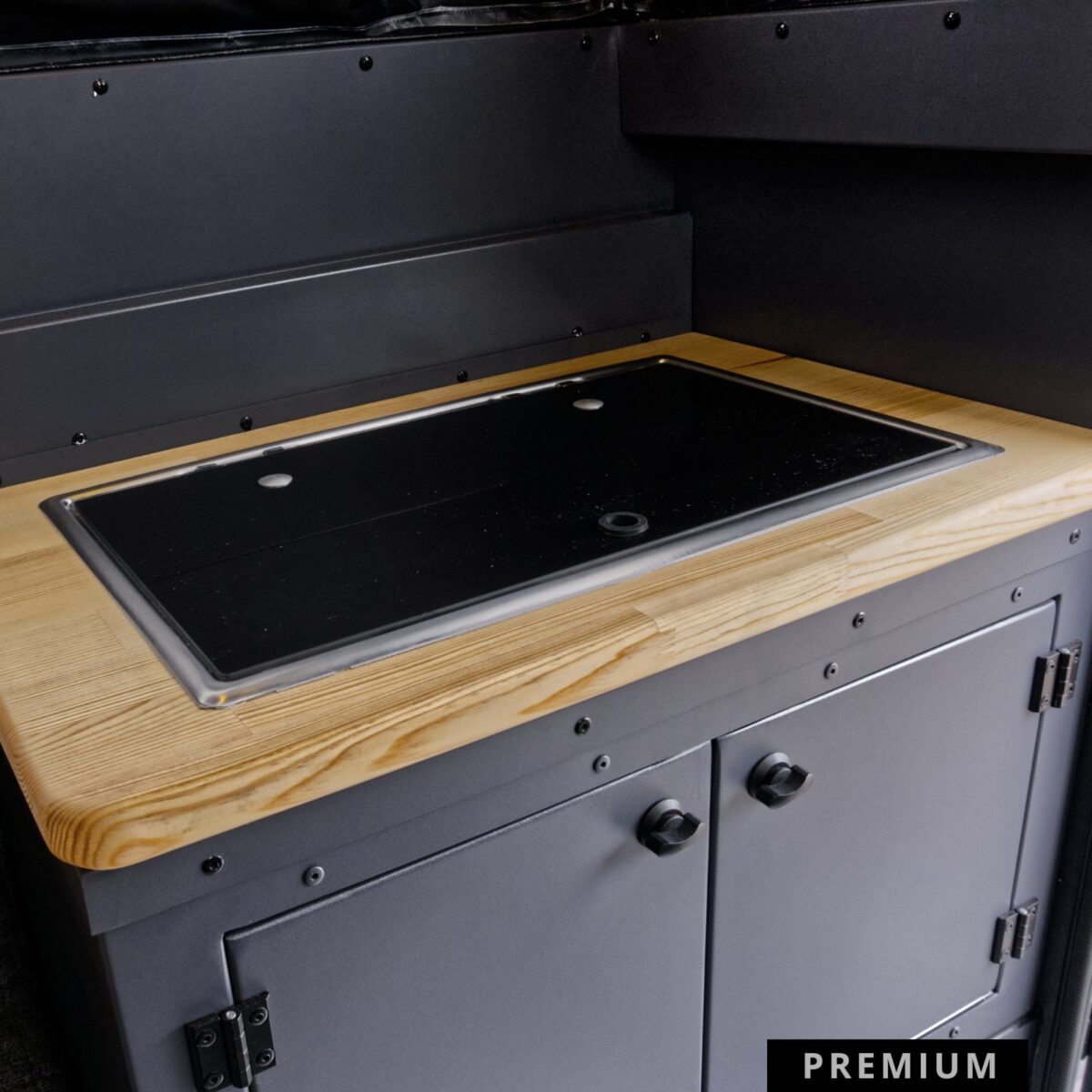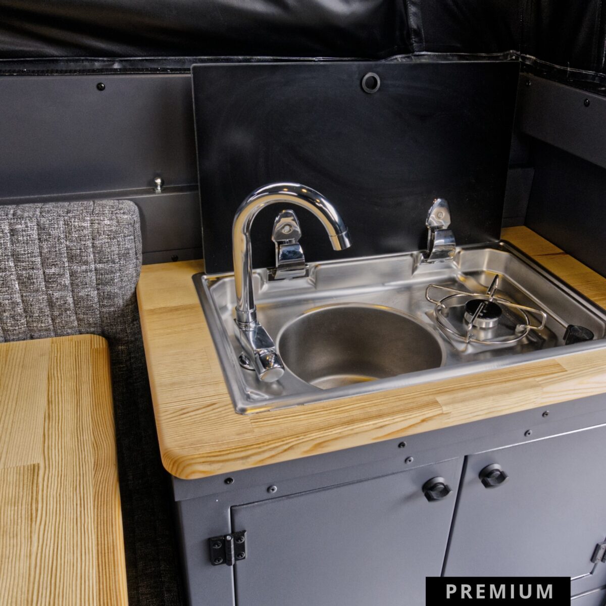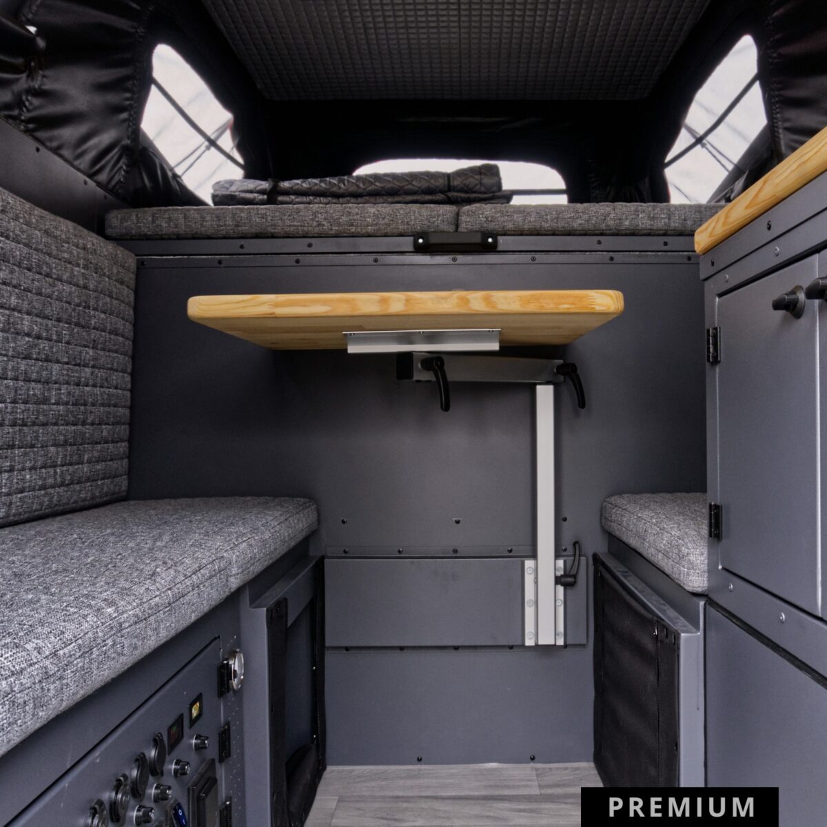Wariant Premium to propozycja dla najbardziej wymagających podróżników, którzy nie chcą rezygnować z wygody podczas długich i ekstremalnych wypraw. Pakiet ten radykalnie zwiększa możliwości autonomiczne oraz komfort kabiny poprzez montaż pełnej kuchni wewnętrznej wyposażonej w zlew, kuchenkę gazową oraz estetyczny, drewniany blat. Najważniejszym udogodnieniem jest zaawansowany system grzewczy Eberspächer S3, który oprócz wydajnego ogrzewania wnętrza zapewnia stały dostęp do bieżącej ciepłej wody użytkowej. Dzięki zastosowaniu potężnej baterii LiFePO4 150Ah oraz inwertera 1500W, użytkownik zyskuje ogromny zapas energii do zasilania dowolnych urządzeń, a powiększone tylne bakisty oferują dodatkową przestrzeń na niezbędny ekwipunek.