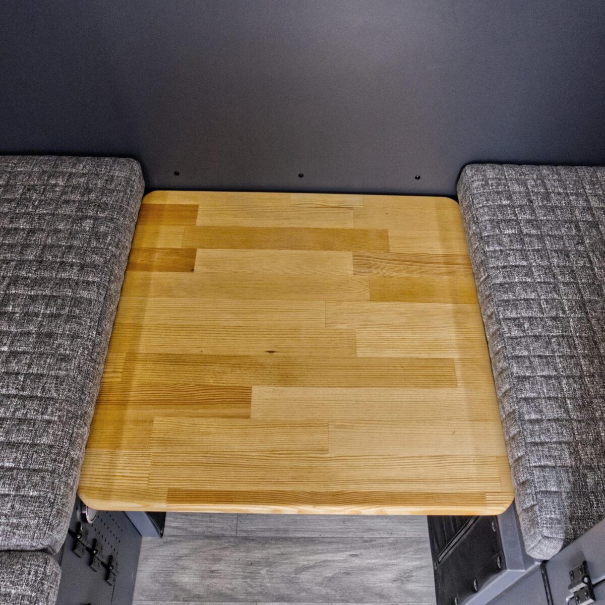 - Strefa dzienna: Tapicerowane ławki (135 x 44 cm) ze schowkami oraz drewniany stolik obrotowy 360° (z funkcją zmiany w dodatkowe łóżko).