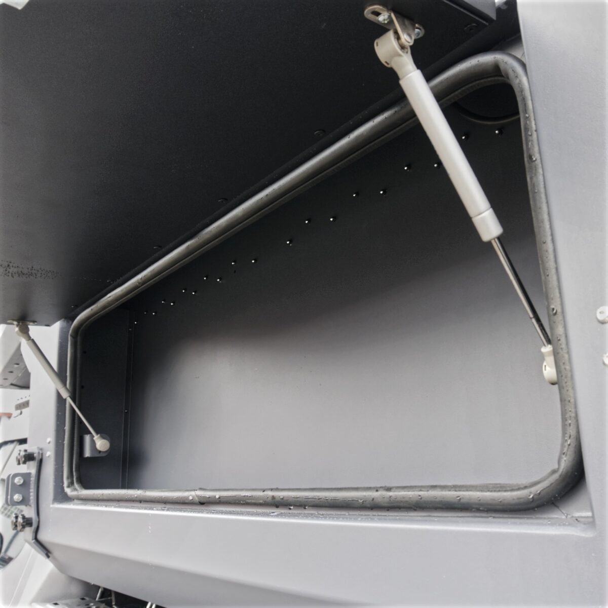 - Pancerne poszycie: Kabina wykonana z aluminium o grubości 3 mm, w całości lakierowana proszkowo elektrostatycznie w kolorze szarym. Gwarantuje najlepsze dopasowanie do wszystkich kolorów samochodów oraz odbijanie światła. W trudnych warunkach pogodowych także najmniej się brudzi.