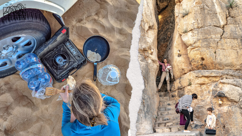 Stare to w tym zestawie były tylko namioty. Szmaciane, duże, z super- twardym materacem. Pałace, w których będziemy spędzali większość nocy w Omanie. Pierwsza noc jednak w hotelu, tu zostawiamy jedną pełną przepakowaną walizkę oraz jedną pustą. To daje nam trochę więcej swobody przy podróżowaniu, ale na pewno tęsknię do swoich Offlanderowych organizerów, zabudowy i przede wszystkim namiotu Fold 4. Mimo, że mniejszy to wygodniejszy.